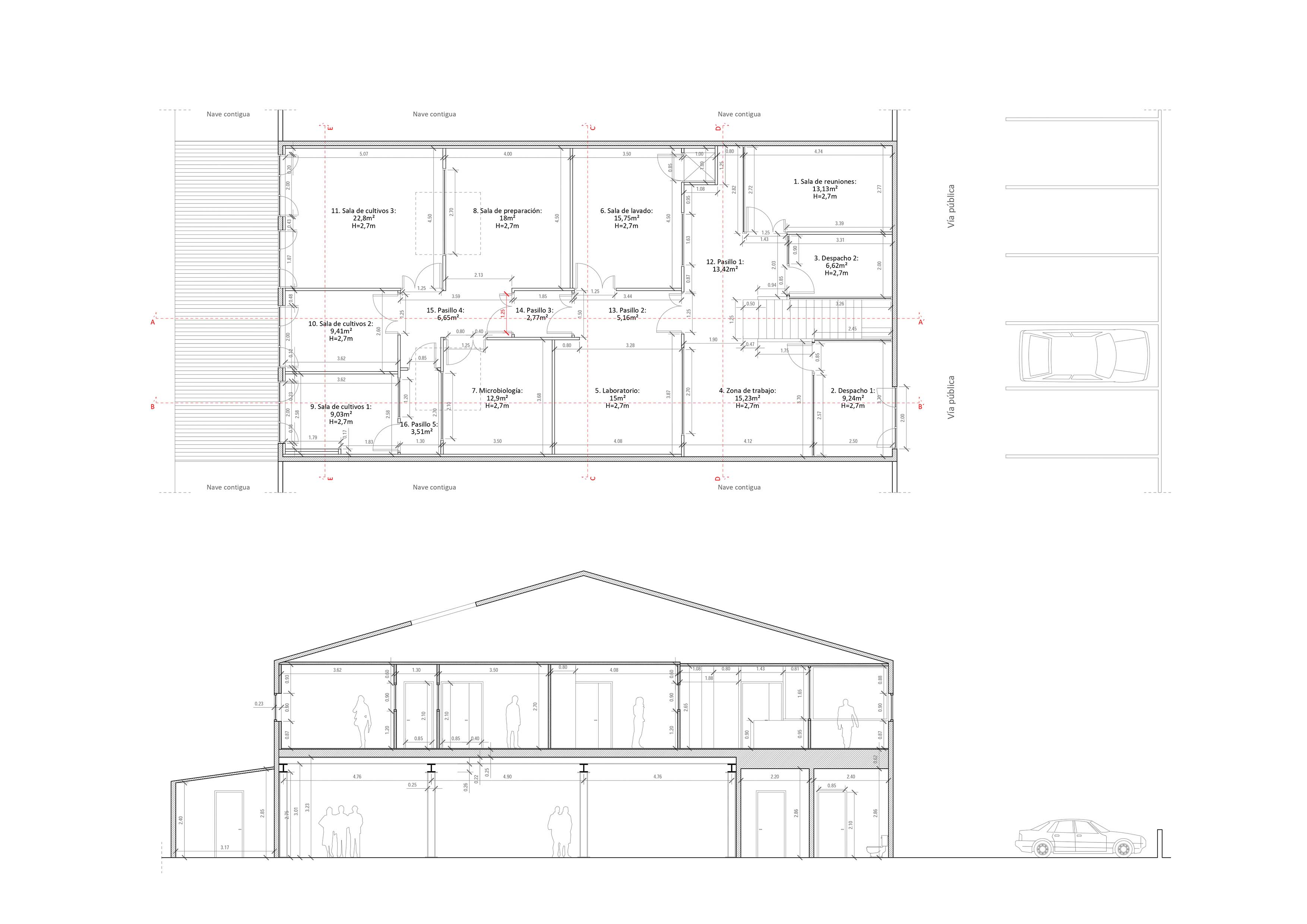 El primer paso del proyecto fue la legalización de la planta primera que incorporaba la nave industrial. Mientras el ayuntamiento concedía la legalización, fuimos diseñando los diferentes espacios del laboratorio junto con Alodia Farmacéutica.